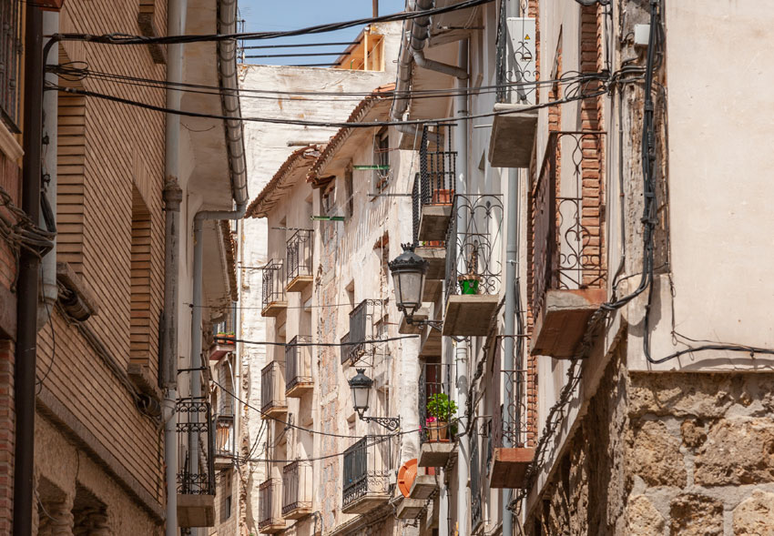 La piedra no es abundante en la construcción y el adobe es muy frecuente pero convenientemente protegido. La presencia del yeso hace que los revocos sean muy abundantes y la decoración en ese material.